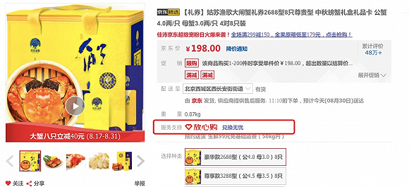 另外值得一提的是,京东生鲜针对“阳澄湖”的产地宣称规定,除可提供政府部门批准文件,否则禁止在蟹扣、网页、包装等宣传物以任何形式宣称阳澄湖产地或暗示阳澄湖产地。