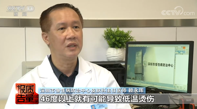 深圳市慢性病防治中心皮肤科主任医师 赖永珲:46℃以上就有可能导致低温烫伤,有时候就说他觉得舒服或者觉得要加重一点,可能时间长也没去算时间,第一次可能是五十度可能就觉得热了,后面适应了可能70℃都不觉得热,特别是如果是质量不好的,温控不好的,很容易就达到那个温度,当发现有问题的时候,可能也已经烫伤了。