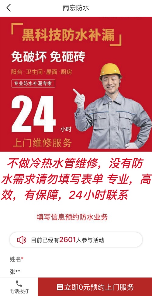然而张女士点击进入后,却没法了解该企业的详细信息,根据要求填写房屋地址后,马上接到了补漏师傅的电话。