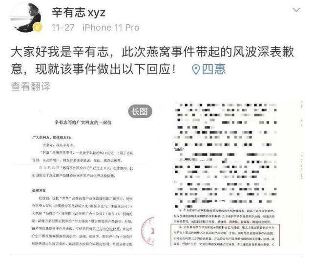11月27日,辛巴(实名辛有志)发布道歉声明,承认“茗挚”品牌燕窝产品在直播间推广销售时,存在夸大宣传,将召回所售产品,并退一赔三,共退赔近6200万元。