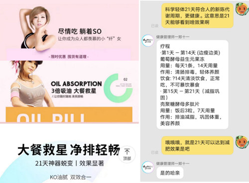 在一款名为“多燕瘦21DAY纤瘦礼包”(包括“葡萄酵母益生元果冻”和“壳聚糖酵母多肽片”)的宣传中,显示有“21天神器蜕变,效果显著”的宣传语。