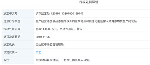案件信息显示,2019年8月,上海宝山区市场监管局接到线索反映蜂了时尚科技(上海)有限公司所经营的多燕瘦酵素吸吸冻(番石榴味)(生产日期:2018年9月17日)检出匹克硫酸钠。资料显示,匹克硫酸钠是一种药品原料,具有缓泻作用,属于非食用物质,在常规标准检测中无法检出,该药品具有明显的不良反应和副作用,必须凭处方、遵医嘱才能使用。
