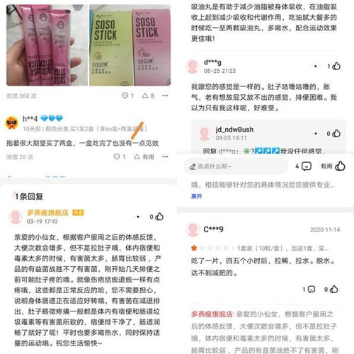 从消费者反映来看,“多燕瘦”也屡遭差评。新京报记者查询天猫平台多燕瘦旗舰店发现,在不少产品的评论留言里,有消费者表示“吃完肚子胀气、难受、排便困难”“吃完之后肚子咕噜咕噜地胀气”,“吃了一片,四五个小时后,拉稀,脱水,根本没有减肥效果”“大便次数增多,一天五六次”等。其中,一款名为多燕瘦SOSO棒蓝莓胶原酵素果冻的产品收获差评4000余条。其他一些平台旗舰店的产品评价中,差评也不在少数。