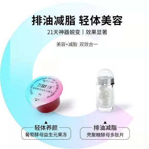疗程信息显示,第1天至第14天(边瘦边美)吃葡萄酵母益生元果冻,用量每天1条, 可以达到清肠排毒,轻体养颜效果。在第15天至第21天(减脂巩固)吃壳聚糖酵母多肽片,可以达到排油减脂,巩固体重,美容养颜效果。
