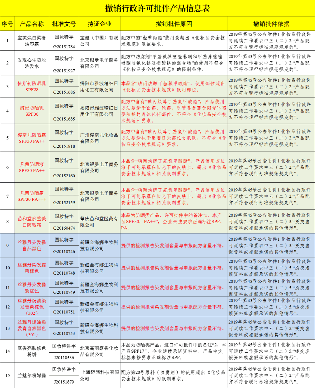 此外,据公告显示,持证企业为新疆金海娜生物科技有限公司的5批次染发霜、染发膏等染发产品,提供的检测报告染发剂含量与申报配方含量不符,被撤销批准文号。