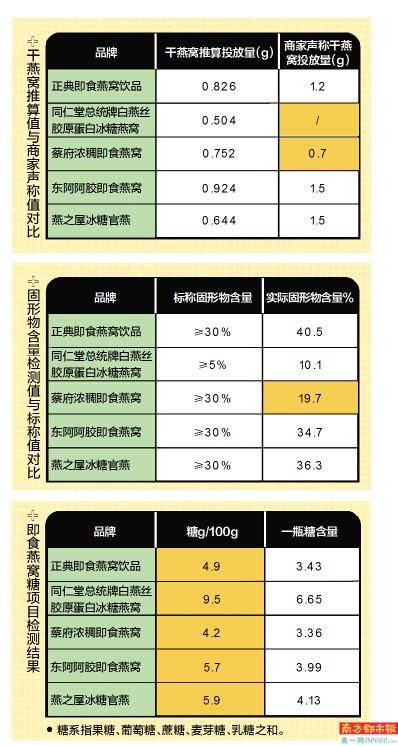 而东阿阿胶、正典和蔡府分别每瓶仅有0.497g、0.413g和0.328g。其中正典和同仁堂两款即食燕窝检出值分别为0.59g/100g、1.89g/100g,略低于外包装营养标签上标识的0.7g/100g、2.0g/100g。