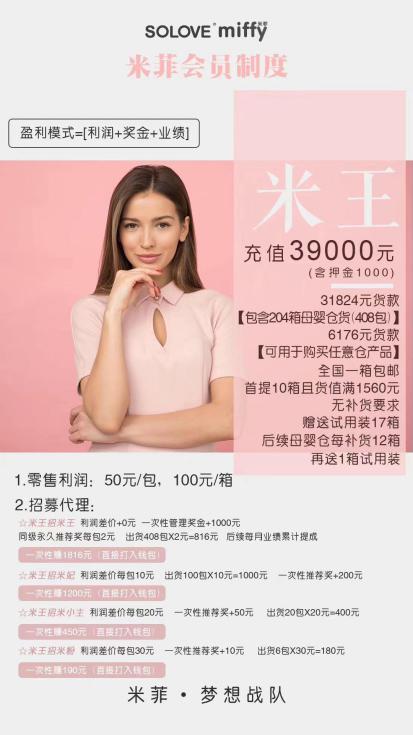 一位米友圈代理家属表示,米友圈公司利用“米友圈”手机APP线上销售杭州千芝雅卫生用品有限公司生产的米菲母婴用品。而母婴用品正是宝妈们热衷的消耗品,这也是米友圈百万代理商多数为宝妈的原因。米友圈正是瞄准宝妈们产品自用需要,时间充足,又有自我价值实现的需求,利用微信、群会等手段快速发展团队。