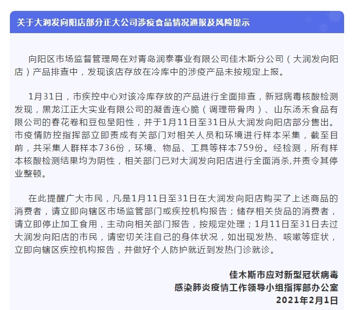 1月31日,佳木斯市疾控中心对该冷库存放的产品进行全面排查,新冠病毒核酸检测发现,黑龙江正大实业有限公司的凝香连心脆(调理带骨肉)、山东汤禾食品有限公司的春花卷和豆包呈阳性,并于1月11日至31日从大润发向阳店部分售出。市疫情防控指挥部立即责成有关部门对相关人员和环境进行样本采集,截至目前,共采集人群样本736份,环境、物品、工具等样本759份。经检测,所有样本核酸检测结果均为阴性,相关部门已对大润发向阳店进行全面消杀,并责令其停业整顿。