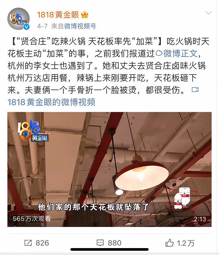 4月7日,《1818黄金眼》报道称,3月11日一对夫妻在贤合庄卤味火锅杭州万达店用餐时,因为天花板突然掉落导致二人分别出现烫伤、骨折等情况,在这之后因为受伤顾客索赔8万、店家提出给到4万赔偿,双方在赔偿金额上难以达成一致,从而诉诸媒体。