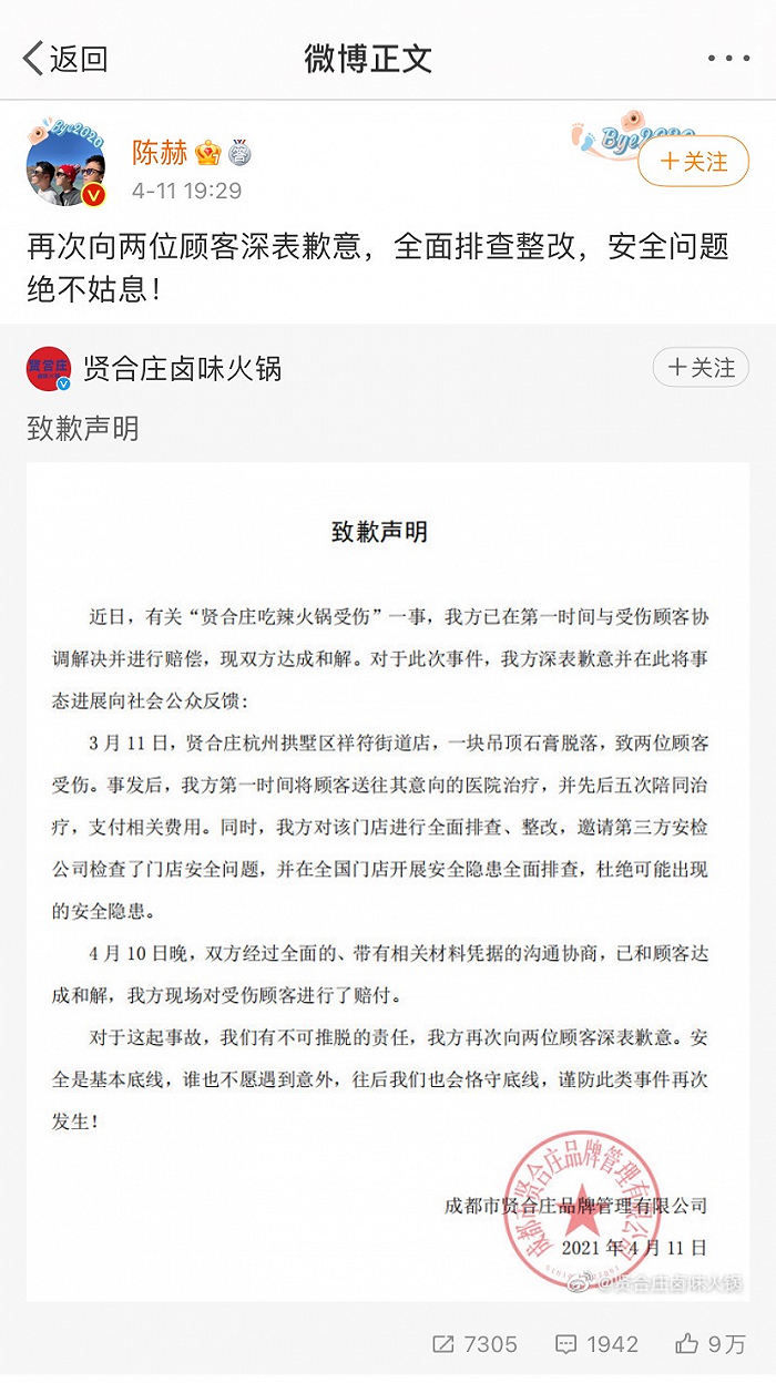 4月11日,也就是事发整整一个月后,贤合庄发表致歉声明表示已与受伤顾客达成和解,并将在全国门店开展安全隐患全面排查,同日,“明星合伙人”陈赫也转发表态“安全问题绝不姑息”。不过该事件仍以“陈赫火锅店”的形式被传播和关注,抖音上“贤合庄”的话题播放量达到11亿,仍在快速上涨。