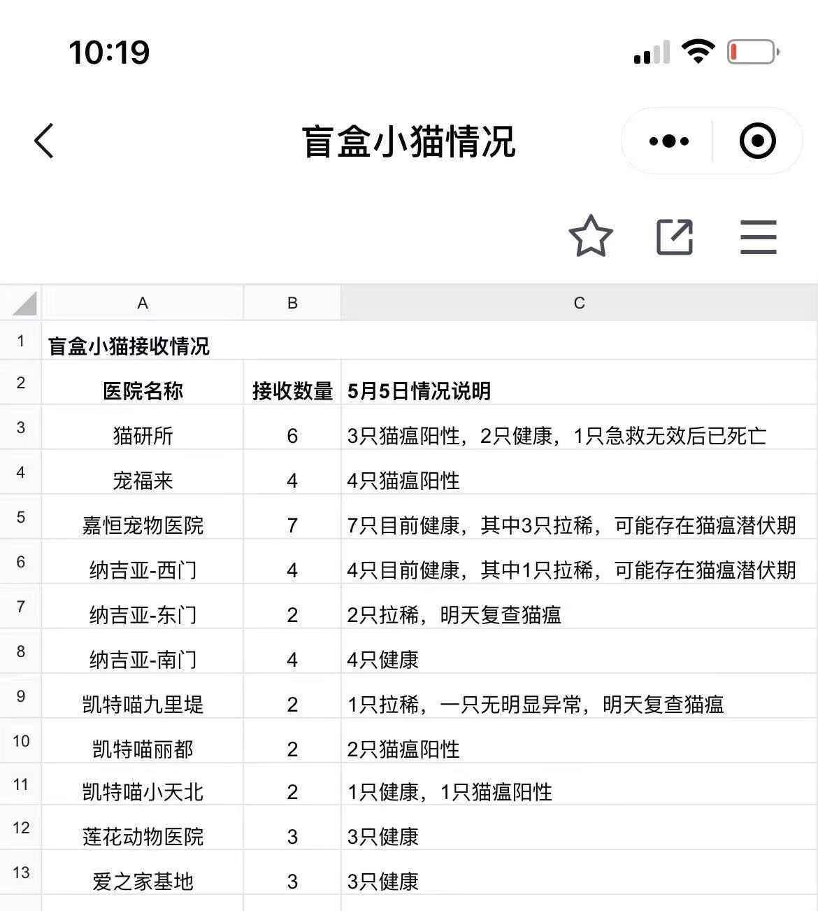 志愿者统计的“盲盒”中小猫的情况,有“拉稀”、“猫瘟阳性”、“猫瘟潜伏期”、“死亡”等情况。受访者供图