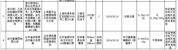 此外,上海爱杰企业管理有限公司龙阳路分公司销售的标称江苏台安国际贸易有限公司进口的義美食品股份有限公司生产的义美花生味威化饼干,过氧化值检出值为0.35g/100g,比标准规定(不超过0.25g/100g)高出40%。
