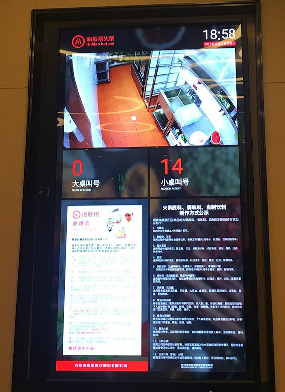 据海底捞公司介绍,劲松店在此次整改后,全店增加了100多个摄像头,其中一半安装在后厨,可覆盖此前后厨存在的监控盲区。店内在一楼大厅和二楼入口位置分别新增了两块直播后厨的大屏幕,屏幕上半部分全天直播后厨画面,包括洗碗间、小吃房、上菜房和配料间等,每个30秒切换一次画面,同时屏幕还显示就餐排队叫号进展、邀请顾客随时参观后厨、部分菜品的食品添加剂使用情况等内容。同时,顾客也可在点餐iPad上切换观看后厨直播画面。