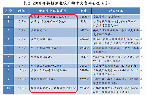 报告显示,食品安全、食品谣言是当下网民关注度最高的两类食品舆情。2018年食品热点事件中,受网民关注度较高的舆情类型主要有六类,食品安全类占比32.2%、食品谣言类占比17.6%,其余为市场动态、品牌争议、行业监管、食品健康等。并列出了2018年传播热度较广的10大食品安全谣言: