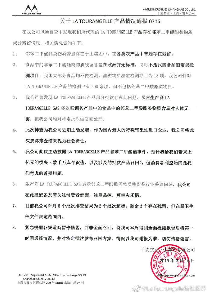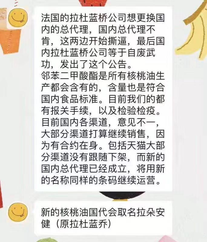 7月15日,一份网传文件显示,千麦实业经自查发现,拉杜蓝乔核桃油产品存在邻苯二甲酸酯类物质成分残留问题,决定暂停销售所有拉杜蓝乔产品,并要求渠道代理商自7月15日起,将相关产品紧急下架,等待召回。