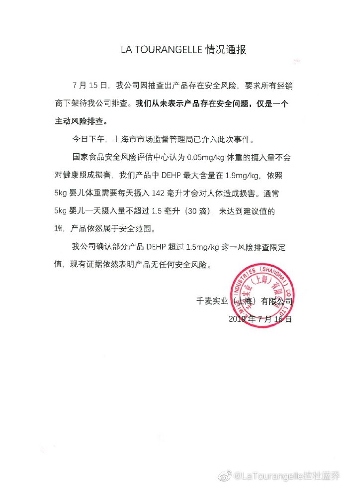 千麦实业再次发布相关通报。来源:LaTourangelle拉杜蓝乔官方微博