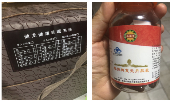 近期,北京市民刘女士的母亲花5万元购买了一套健龙健康睡眠系统床上用品、几瓶馨情牌复元丹胶囊和一大包藤茶。据刘女士介绍:“商家说将床垫和胶囊配套使用,可以调理高血压、高血糖、静脉曲张等多种慢性病,达到延年益寿的效果。”