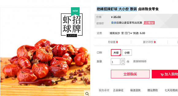 在绝味食品天猫旗舰店,目前有一款名为“绝味招牌虾球”的小龙虾产品在销售,生产商为湖南阿瑞食品有限公司,大份的售价35元,小份为20元,不过两款的月销量和累计评价都为零。
