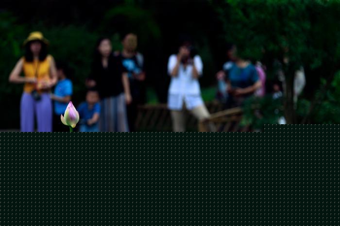 资料图:荷塘内美丽的荷花吸引游客争相拍照。 汤彦俊 摄