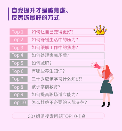 日前,百度发布的《30+姐姐搜索大数据报告》也显示,30+女性经常搜索“如何让自己变得更好”、“如何舒缓生活中的压力”、“如何缓解工作中的焦虑”等如下问题。