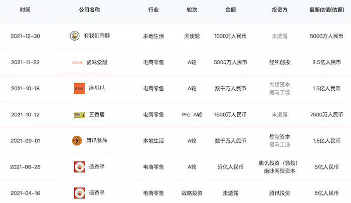 此外,卤制品赛道竞争激烈,“新人频出”。IT桔子显示,2021年,盛香亭、麻爪爪、卤味觉醒等卤味品牌相继获得大额融资。
