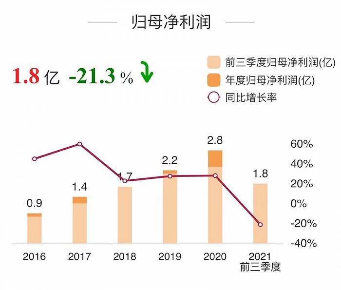 2021年三季报显示,煌上煌前三季度的营业收入为19.33亿元,同比下滑0.1%,净利润仅有1.84亿元,同比下滑21.3%。