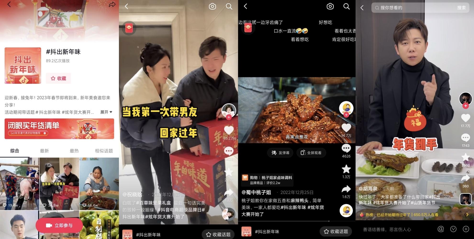此外,抖音电商食品健康行业还基于过年热议话题,为消费者搭建好“内容场”。活动期间,抖音电商食品健康行业开启#抖出新年味话题,通过#炫年货大赛开始了 等热点内容,邀请明星达人胡海泉晒年货,也让用户从被动的“围观者”,转变为年货话题的积极“参与者”,打造浓浓的过年氛围。得益于用户高涨的分享欲,#炫年货大赛开始了 话题挑战赛一经上线,就冲到了种草榜TOP3,挑战榜TOP6。
