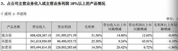 克明面业以生产“陈克明”牌挂面产品为主,财报数据显示,该公司在2016年实现营业总收入21.63亿元,比上年同期增长18.65%;归属于上市公司股东的净利润1.37亿元,比上年同期增长26.7%。其中,强力面、高筋面、如意面为三大主力产品,营业收入占总营收的90%以上。