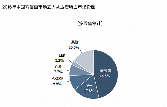 据弗若斯特沙利文咨询公司数据显示,按照销售额算,过去一年今麦郎拿下了9.9%的中国方便面市场份额,排在康师傅和统一后面。同时,还要和白象、日清两个品牌竞争。