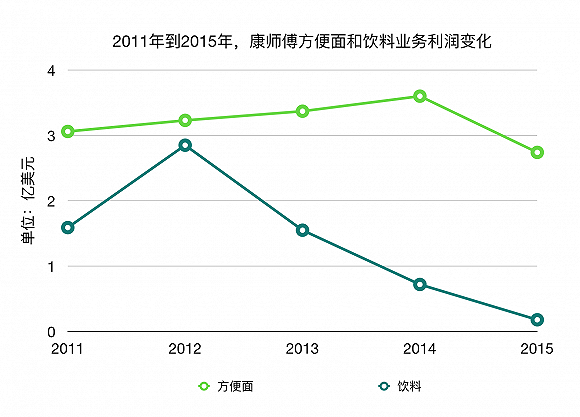 但是不可否认的是,2014-2016年,康师傅营收都在下滑,从2011年到2015年,康师傅方便面和饮料业务利润变化图来看,这两个业务真的是越来越不赚钱。