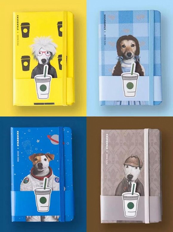 Pet's Rock的风格就是宠物与名人形象的结合,因此这次的狗狗形象包括福尔摩斯和安迪沃霍尔等4个形象,而合作产品除了四款星杯外,还有笔记本、手机壳星礼卡以及福袋。福袋售价258元,包括一个拎包以及星杯和手机壳等。