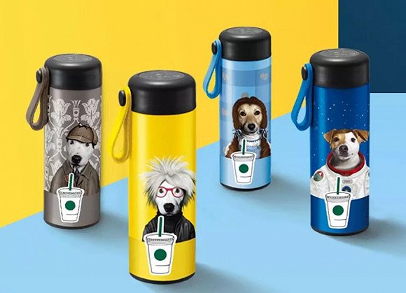 同样走狗狗路线的星巴克就显得潮多了,他们和英国潮宠品牌Pet's Rock合作,推出了狗年主题的生肖星杯,还有一大堆周边。