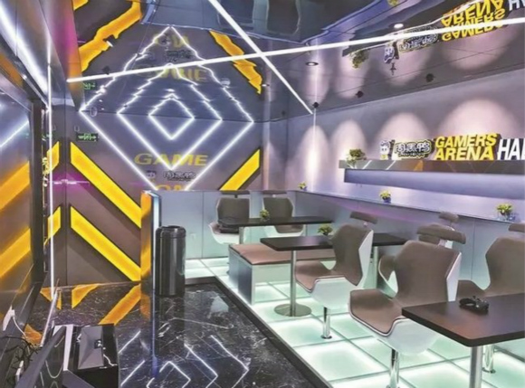 这家电竞主题店的设计延用了周黑鸭黄色和褐色的主题色,同时还增加了更多金属材质、几何图形及镜面效果,希望以此营造出时尚感和黑科技的氛围。
