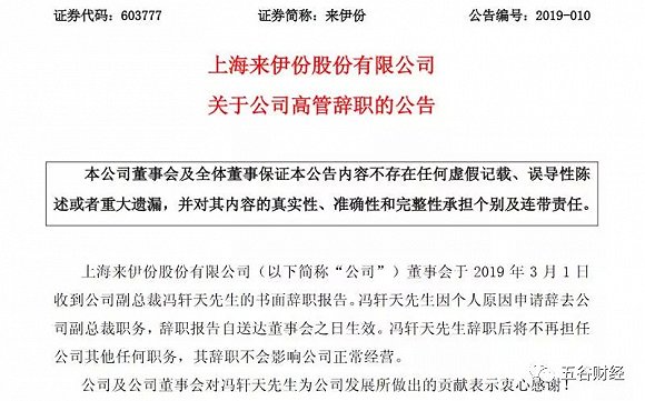 “冯轩天因个人原因申请辞去公司副总裁职务,辞职报告自送达董事会之日生效。冯轩天辞职后将不再担任公司其他任何职务,其辞职不会影响公司正常经营。”来伊份方面称。