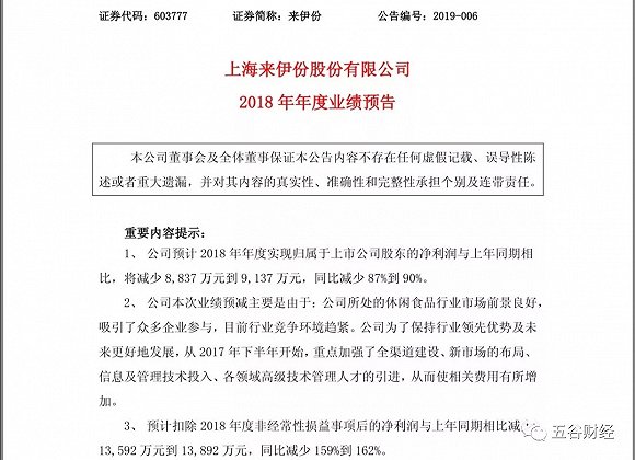 据来伊份2018年年度业绩预告,预计2018年实现归属于上市公司股东的净利润比上年同期减少8837万元到9137万元,同比减少87%到90%;