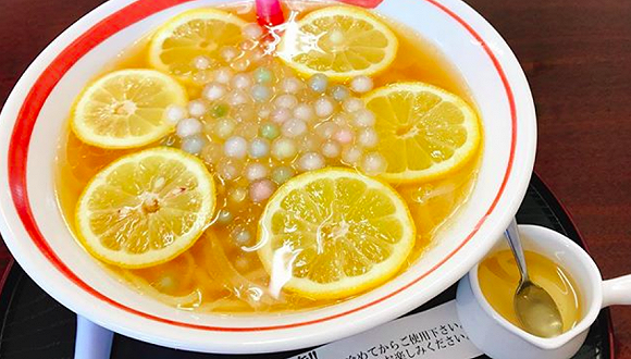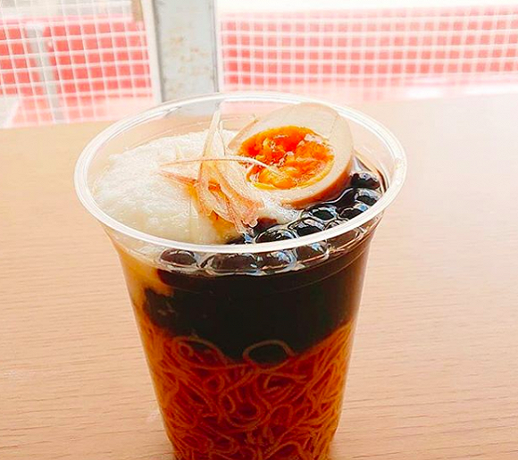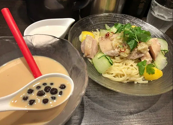 比如珍珠奶茶拉面——位于日本福冈白河的拉面店“太鼓のぼお ”就推出了一款盐、味增和柠檬为汤底的珍珠拉面,一度登上日本版大众点评“Tabelog”的打卡热门榜单;东京的“面屋武藏”则把日式蘸面的汤头换成了珍珠奶茶,每吃一口面都要在奶茶里走一圈。