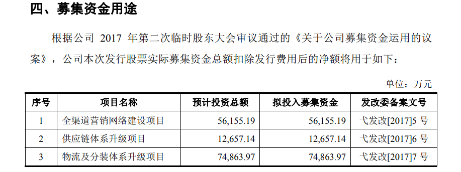 良品铺子拟募集的7.73亿元资金中,“全渠道营销网络建设项目”将投入4.46亿元、“仓储与物流体系建设项目”、“良品信息系统数字化升级项目”、“食品研发中心与检测中心改造升级项目”分别投入1.93亿元、1.06亿元、2724.3万元。这同样是为了未来的渠道、供应链打基础。