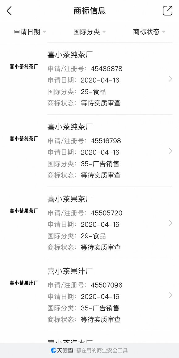 而在更早的4月,喜茶还曾密集注册过如“喜小茶纯茶厂”“喜小茶果茶厂”“喜小茶汽水厂”等商标,这些商标目前仍未出现在喜小茶所销售的产品上,也没有开设门店。