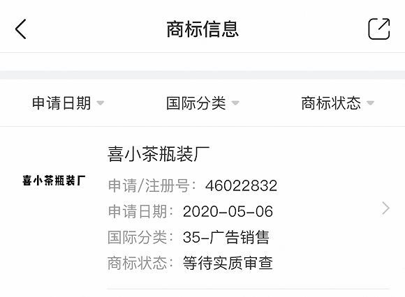 而快消品网通过天眼查发现,在5月6日,喜茶母公司、深圳美西西餐饮管理有限公司已经申请注册了一个名为“喜小茶瓶装厂”的商标。这极有可能便是喜小茶未来预包装产品的名称。