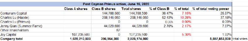 开曼法院6月16日判决后瑞幸公司的股权和投票权结构