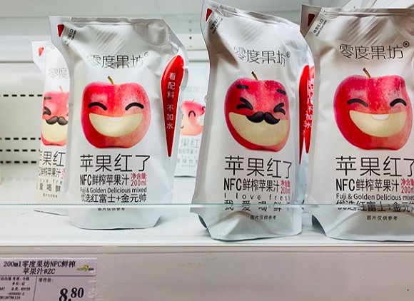 快速消费品网了解到喜茶在它全国数百家门店内摆出了喜小茶NFC果汁,售价19元,含桃子和芒果两个口味;盒马的货架上摆上了其自有品牌的NFC果汁,300毫升的多肉葡萄和粒粒桃桃两款产品;零度果坊也推出了新品,直立袋包装的两款产品价格,200毫升的“苹果红了”和“橙子熟了”两款NFC鲜榨果汁,它尝试着压低售价,把NFC果汁首次降低至10元一下,以8.8元的价格让更多人来尝试。