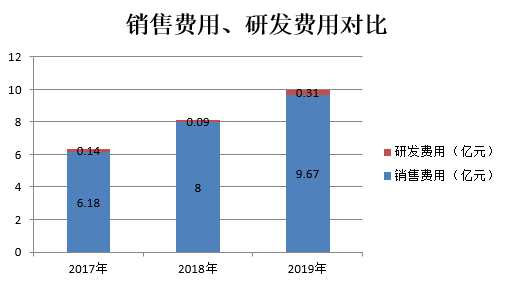 据统计,2017-2019年,香飘飘全年净利润分别达2.68亿元、3.15亿元和3.5亿元,而销售费用却高达6.18亿元、8亿元和9.67亿元,销售费用均达到了净利的2倍以上。