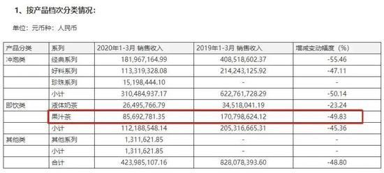 果然这二者不能过多指望,今年一季度,液体奶茶和果汁茶类产品销售额出现了锐减,分别同比减少23.24%、49.83%