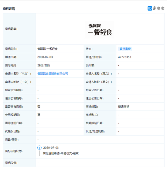 近日,企查查数据显示,香飘飘食品股份有限公司新增多条商标信息,其中包括了“香飘飘·一餐轻食”,申请日期为2020年7月3日,商标状态为“等待实质审查”,分类包括方便食品、啤酒饮料等。