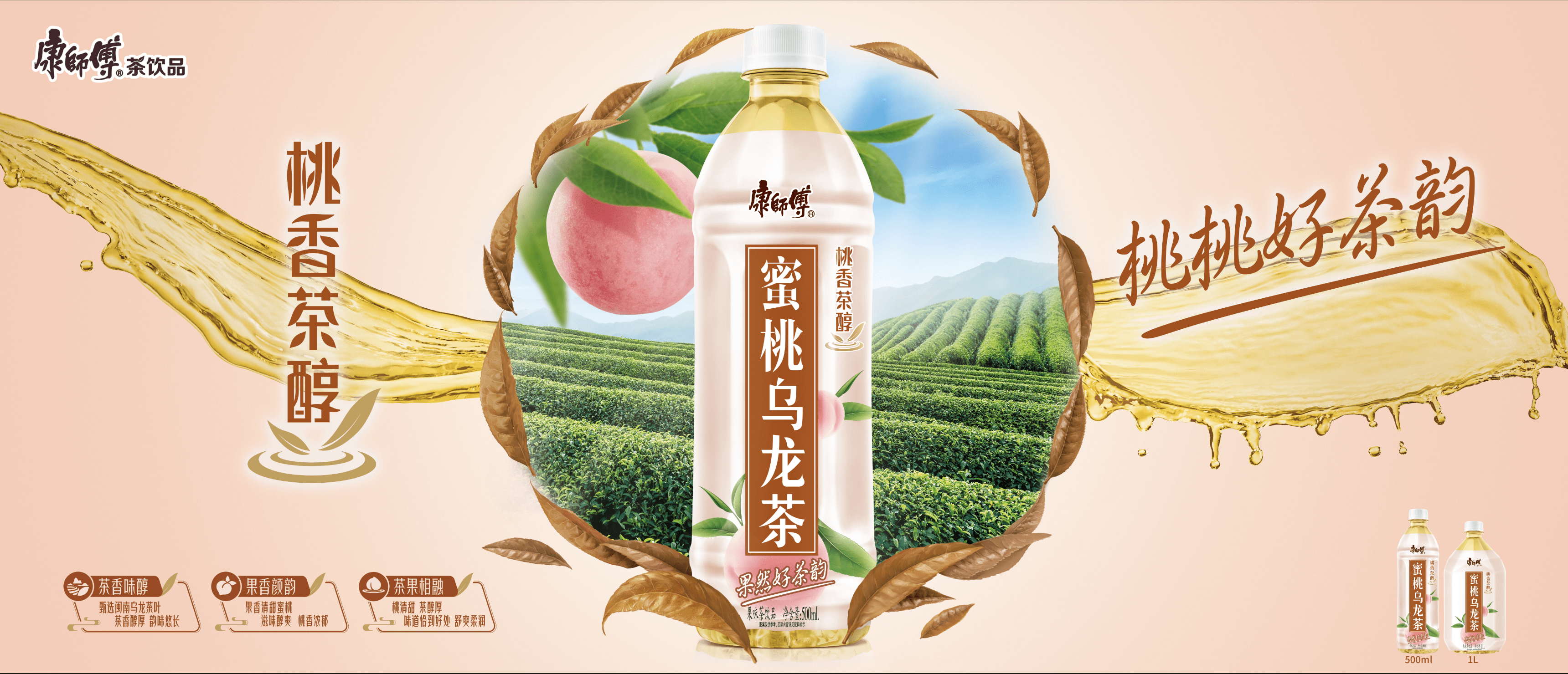 康师傅蜜桃乌龙茶以闽南乌龙茶叶,成全茶香醇厚、韵味悠长的“茶香味醇”口感,并精选自然鲜甜蜜桃,带来滋味鲜醇、桃香浓郁的“果香颜韵”体验。工艺上则采用专利果萃技术,让茶果自然相融,桃清甜、茶醇厚,味道恰到好处,醇香怡神的同时更清润身心。其黄金果茶比例,更为消费者带来“一口桃桃好茶韵”的绝佳口味,令其在果味茶饮中拥有显著的产品力优势。