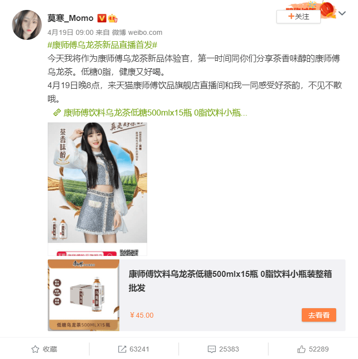近几年,“明星同款”在年轻消费群体中极具号召力,这一现象的背后,体现的是年轻圈层消费方式由理性向感性转变的当下,明星聚集流量并变现的能力。这一次,康师傅乌龙茶新品选择与来自国内最大女子偶像团体SNH48的莫寒、段艺璇、张雨鑫合作,正是基于她们所具备的超强带货能力的考量——与传统明星不同,其拥有极强的粉丝变现能力,堪称“粉丝经济”的典范,在品牌合作的配合度、内容传播、扩散层面具有先天优势。