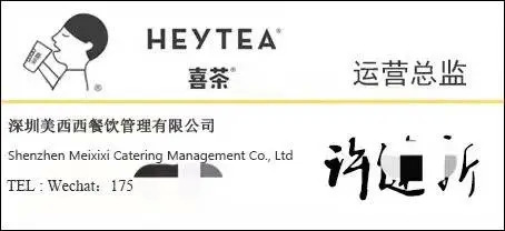 我加盟“喜造”的主要原因是看中了“喜茶”的知名度。加盟之前,招商人员多次在电话和现场沟通时提到“喜造”就是“喜茶”旗下的奶茶品牌。他们给加盟商的名片上也印有明显的“喜茶HEYTEA”品牌名称及logo标识。