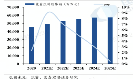 随着年轻人熬夜比例的增加以及上班族工作压力日益加大,功能饮料的饮用场景不断扩大,从以补充能量为主,扩展到餐饮、聚会、工作、学习、驾驶等多个场景。场景拓展后,相应的人群也有所增加,不仅是卡车司机、快递员、理货员、外卖小哥、建筑工人等刚需的人群需要缓解疲劳,过度休闲的中老年人、报复性休闲的年轻人也成为功能饮料的消费主力军。欧睿数据显示,2020-2025年我国能量饮料行业零售额CAGR有望达到达到4.8%。
