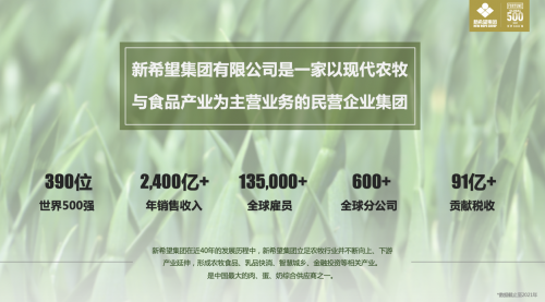 新希望集团,世界500强企业,中国最大民营企业之一,年销售收入2400亿+,全球雇员13万+,全球分公司600+,贡献税收91亿+。