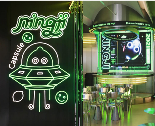 去年8月,柠季的长沙旗舰店也升级为太空舱概念店,碰撞大胆的装潢,为柠檬披上了赛博朋克的外衣,酷得“清爽不油腻”,颠覆了柠檬茶的传统形象,与Z世代消费人群对上暗号。